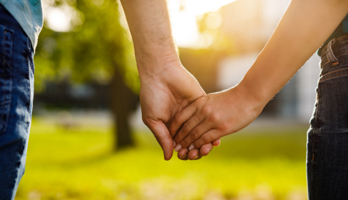 A couple holding hands while walking through a park, reinforcing their connection and comfort with each other.