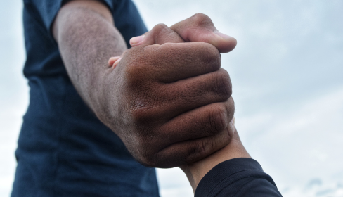 A warm, embracing hug between long-time friends when they meet after a long period apart, expressing their joy and affection.